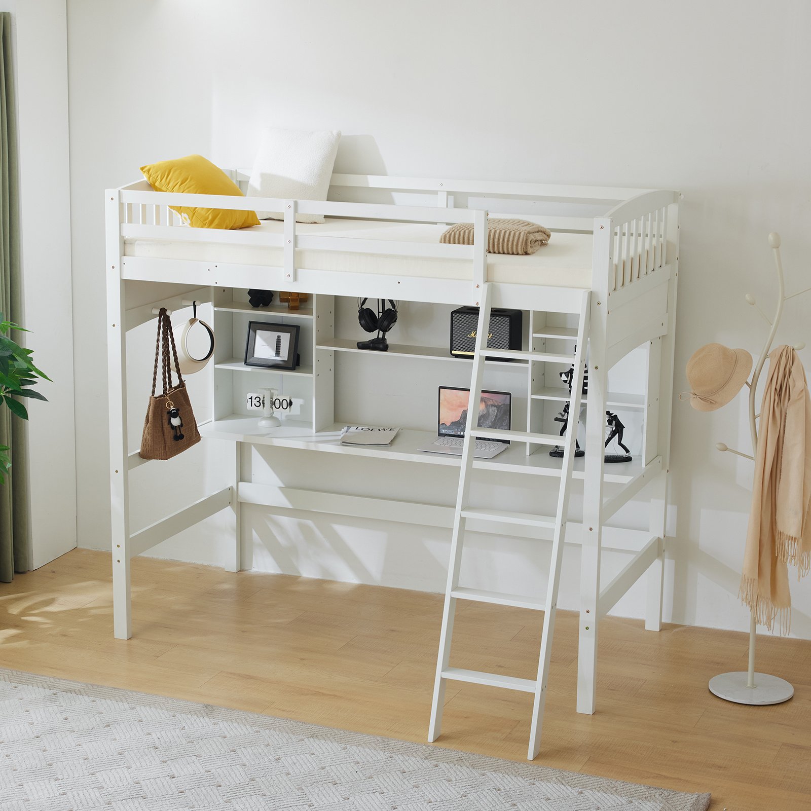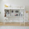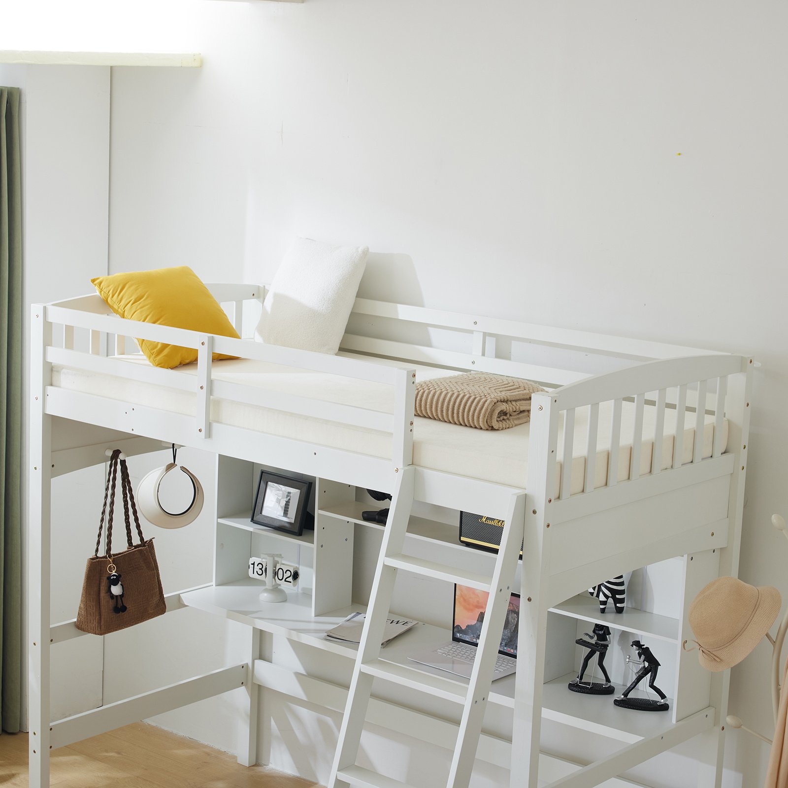 Loft bed with shelf with desk inclined ladder white twin wooden bed pine particle board N101 USA