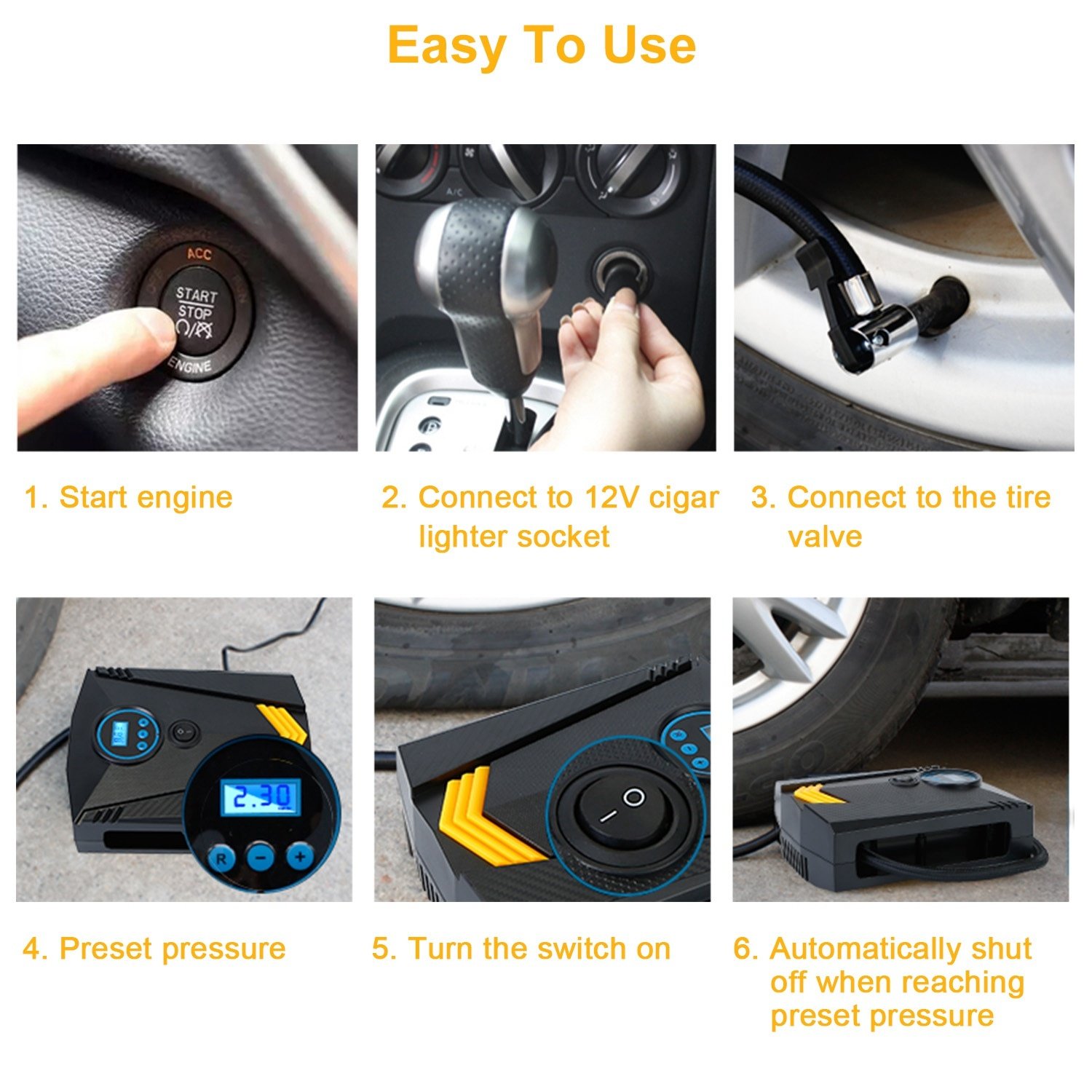 *EASY TO USE*:Plug the power connector into 12V cigarette lighter socket or other 12V outlet,next connect the air hose tightly with the tire valve,then set the presser to preferred value,finally,press the power button to turn on the inflator and it will start to inflate the tire. After use you can easily organize the hose and power cord to the side of our inflator.